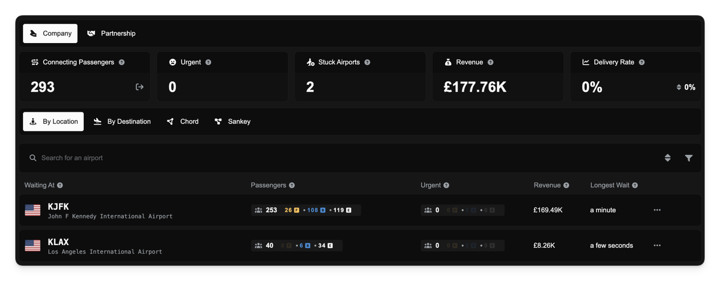Companies now have a dedicated command center for managing their collaborative network. The new Collaboration Dashboard provides a high-level overview of how passengers are moving (or getting stuck) within your company and/or partnership.