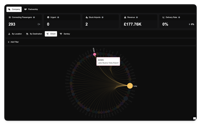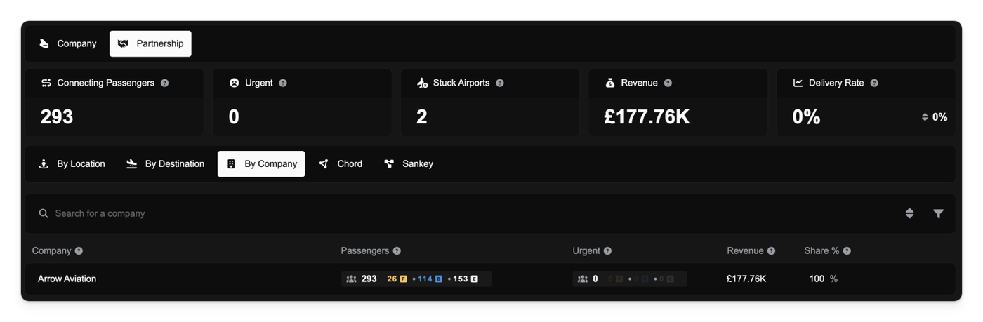The dashboard highlights key performance indicators such as Delivery Rate (how effectively you are moving passengers) and Stuck Airports (bottlenecks where passengers are piling up). You can switch between viewing data for your specific company or the entire partnership to gauge overall health.