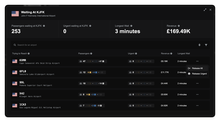 You can choose to release All Demand or specifically Urgent Demand (passengers who have been waiting past the 14-day threshold). This can be done globally from the dashboard overview or granularly for specific airports or routes via the detailed airport dialogs.