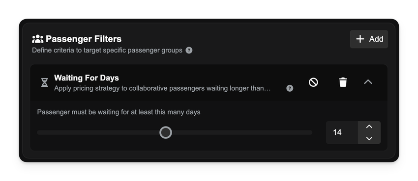 The Waiting For Days filter allows you to apply specific pricing rules (such as aggressive discounts) to collaborative passengers who have been waiting longer than a set number of days. This helps prioritise clearing older demand from your system without manually intervening on every route.