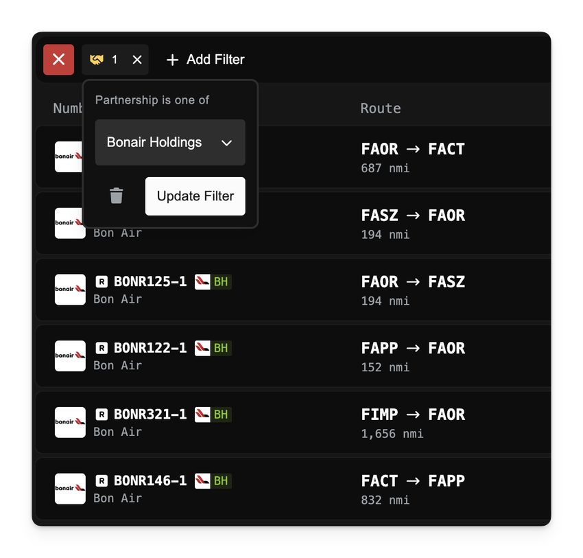 When filtering jobs, you will see a new "Partnership" filter. Simply select one or more partnerships from the list, and the flight board will instantly update to display only flights from member companies. This makes it simple to support your partners, find specific charter flights from a major alliance, or just explore the operations of different groups.