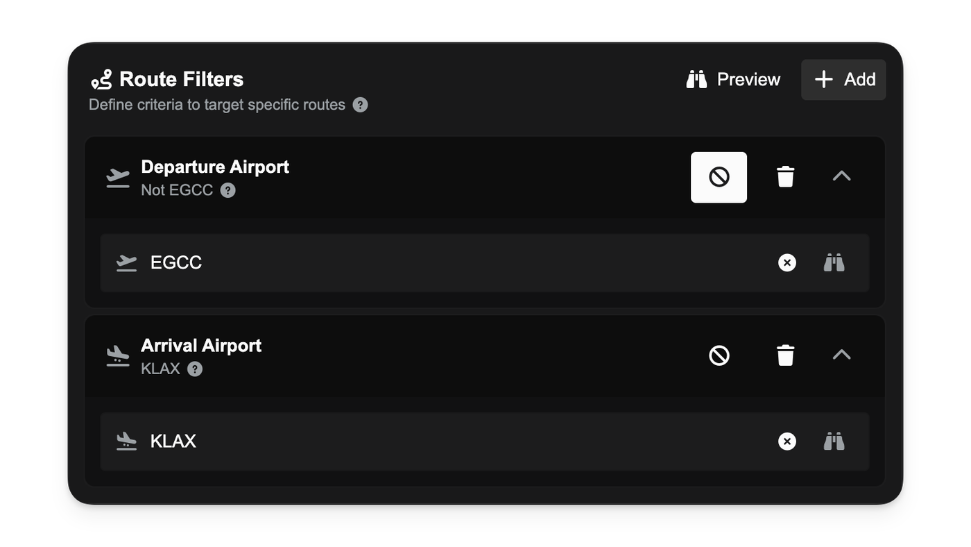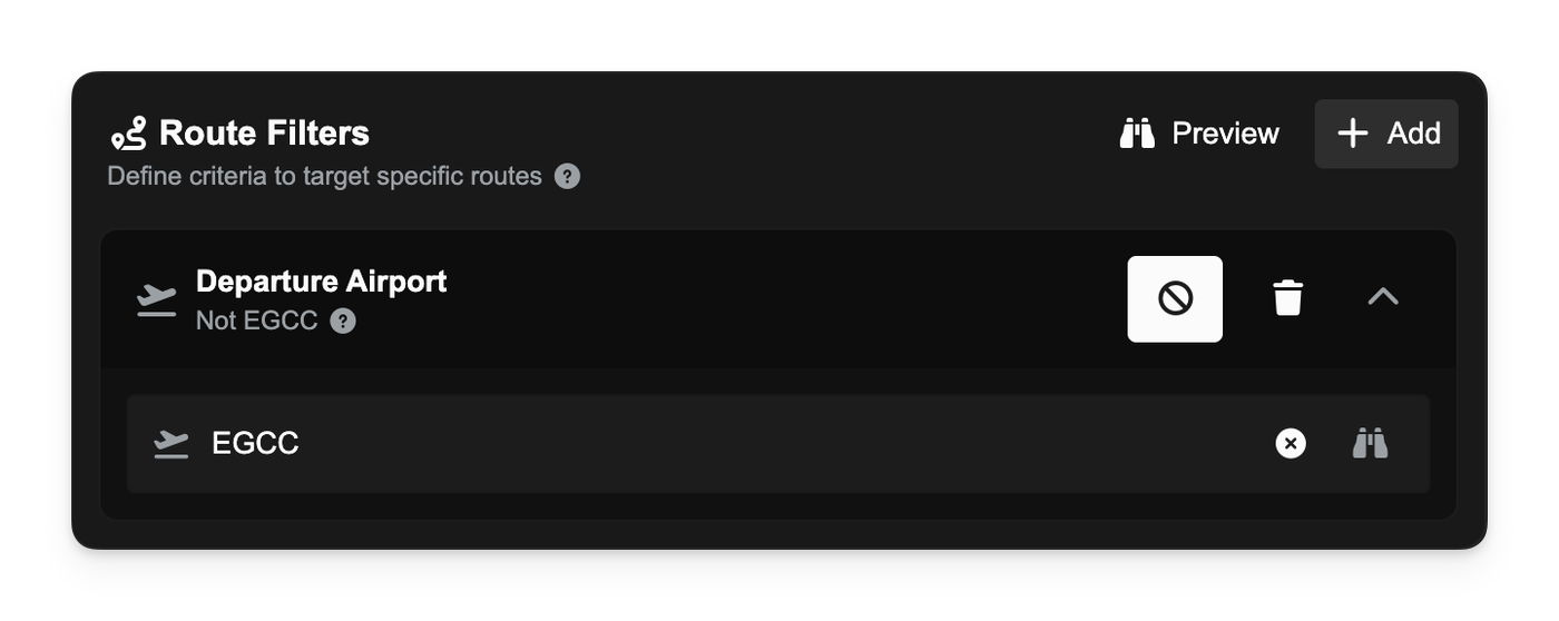 You can now negate any route or passenger filter in a pricing strategy. This lets you target everything except a specific airport, country, distance, or journey property.