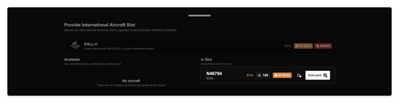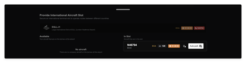 If you need to free up the slot sooner for another company aircraft, you can now manually trigger the auto-parking process. A new "Auto-park" button appears for any aircraft currently in its grace period, giving you more direct control over your valuable airport slots.