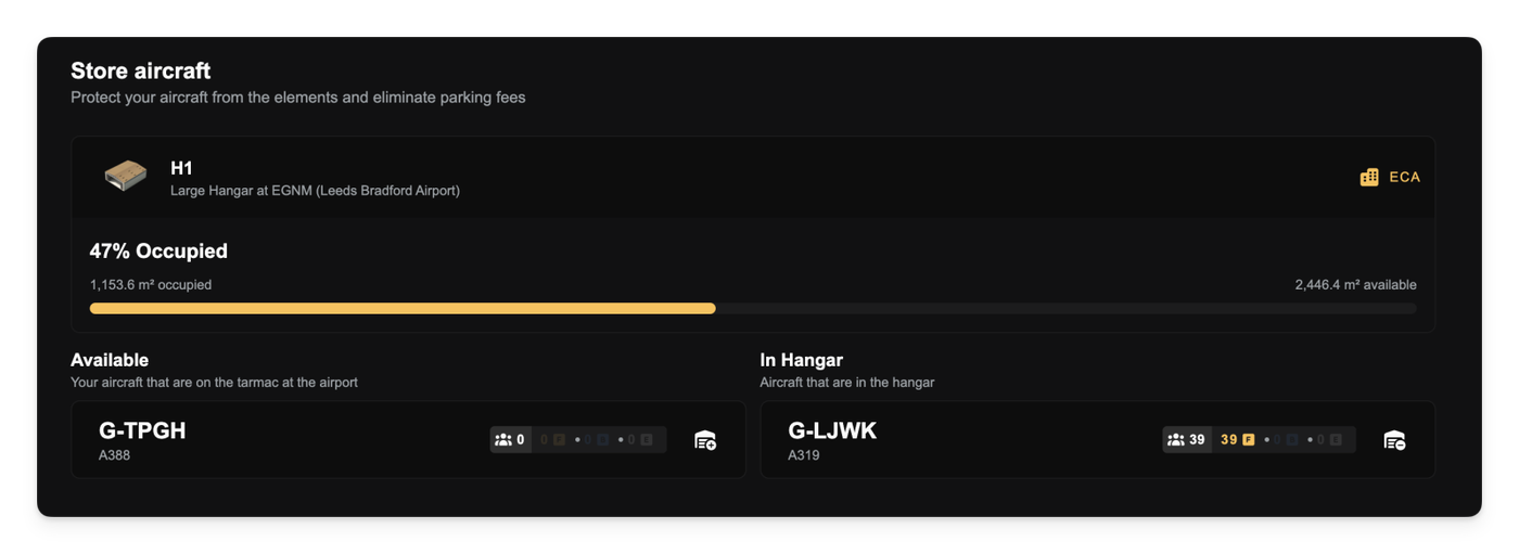 Aircraft can now be stored in hangars to eliminate parking fees and prevent unnecessary wear and tear. Any aircraft landing on a charter job will automatically check themselves into an available hangar, however you can manually move aircraft into and out of hangars using the building configuration page.