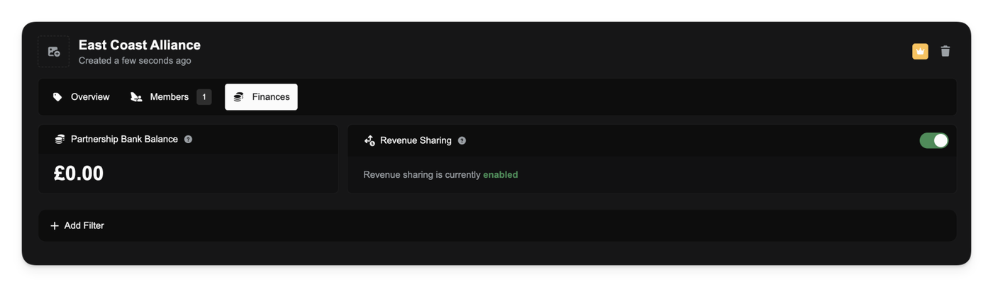 As a partnership manager, you'll find a new Finances tab in your partnership panel. From here, you can enable revenue sharing, which instantly creates a shared bank account for your partnership.