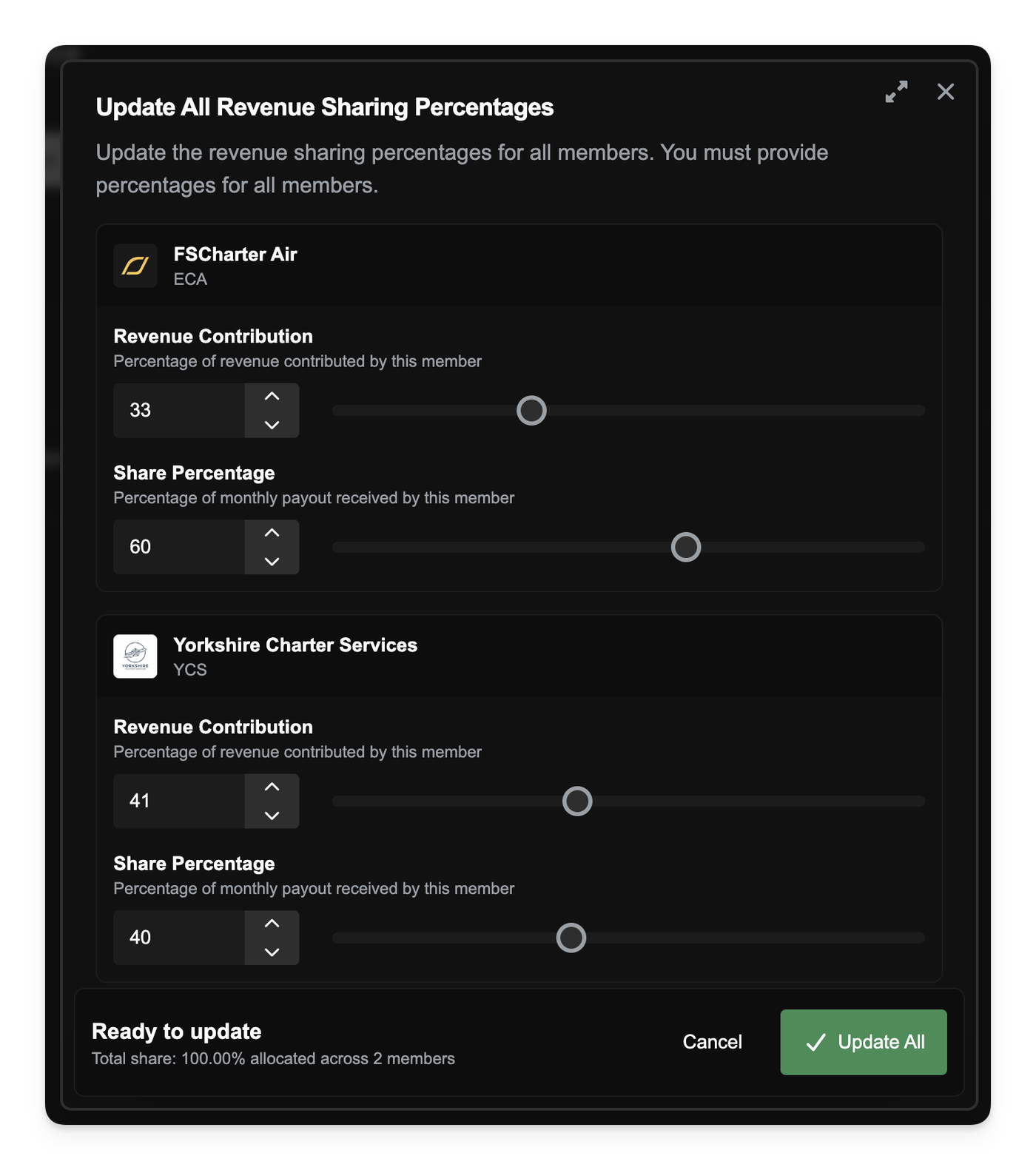When you first enable revenue sharing, all existing members are set to 100% contribution and an equal share. You can then customize this using the new Update All Revenue Sharing Percentages tool on the Members tab. This allows you to set two key values for every member in the partnership: