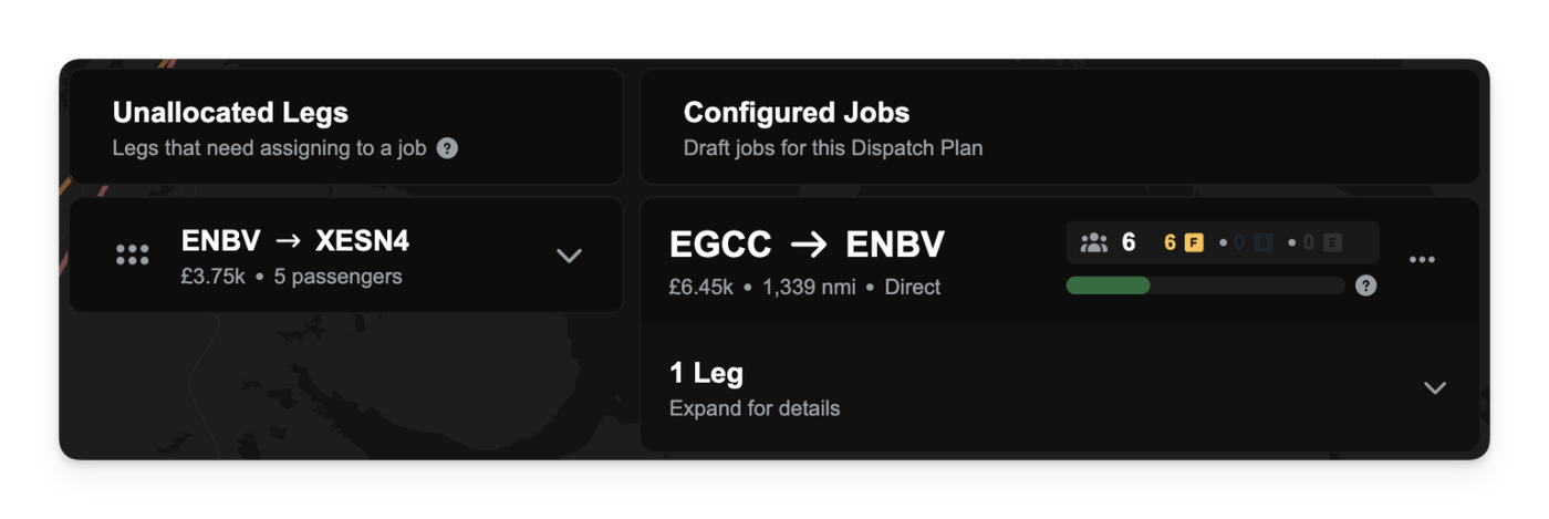 When building Dispatch Plans in the Operations Cockpit, you'll see a new Charter Passenger Capacity bar for each job. This bar tracks the passenger count on the job's busiest leg and changes color as you approach the limit—from green, to amber (at 80%), and red once you hit 20 passengers.